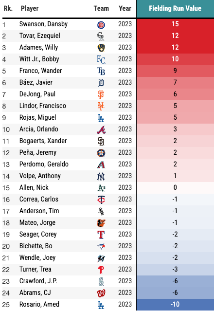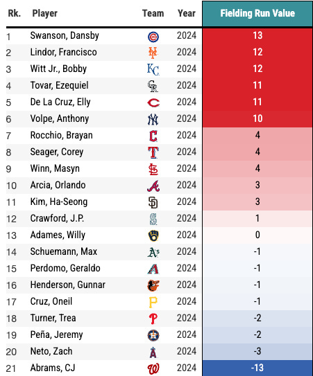And again, workload matters. Arcia had the 12th-most innings in 2023 and the 7th-most innings in 2024, so it’s even less impressive when he’s being beaten out in OAA by guys who played fewer innings than him (Corey Seager, at +4 despite only 959 innings) or lapped him multiple times despite a similar workload (the entire elite group).