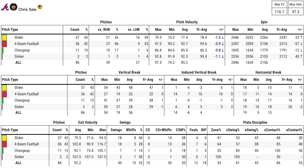 A bigger…observation (?) to me was his velocity. Sale topped out at 97.3 mph in the first inning but didn’t throw another fastball over 93.7 after the first. He also went away from the heater late, throwing just five in a fifteen-pitch 5th inning. As expected, most of that went to the slider, with six of the eight pitches in the 4th being breaking balls.