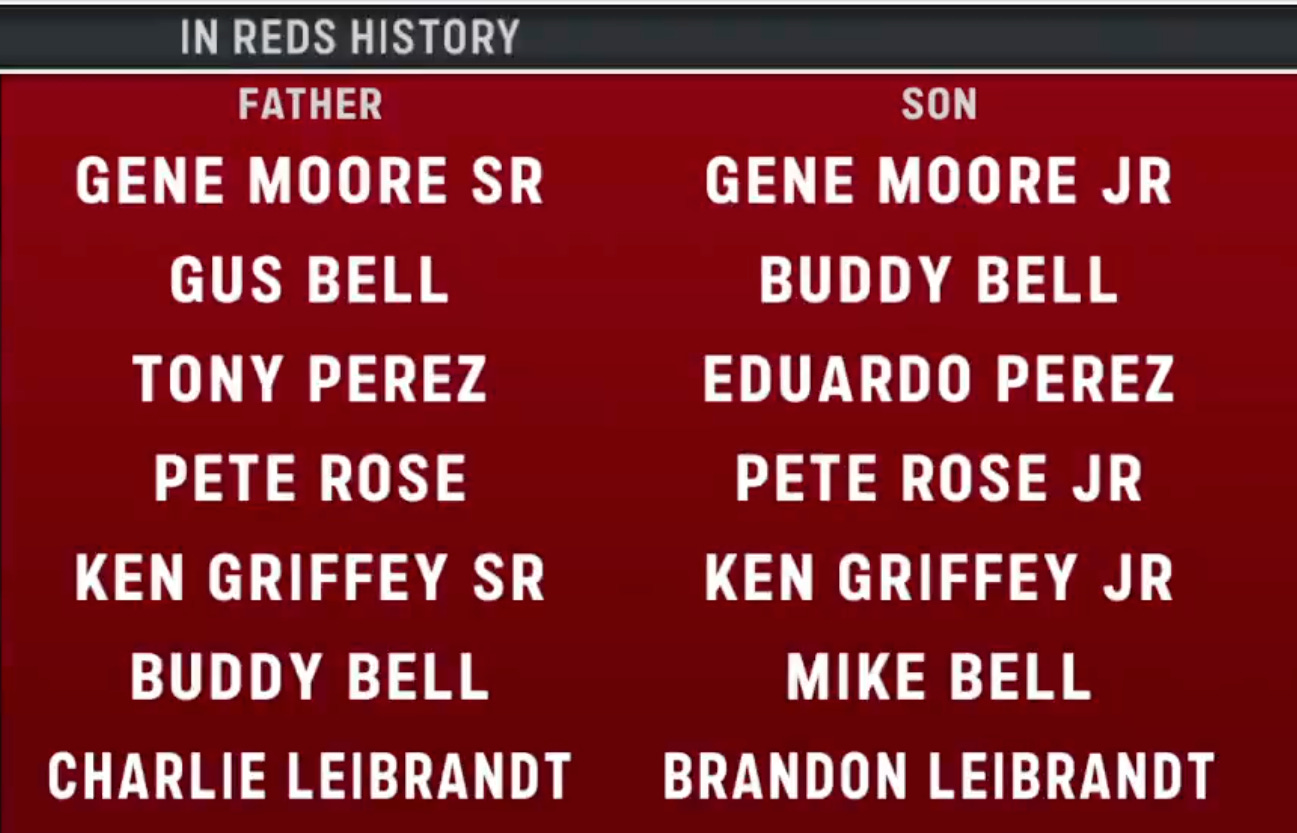 Yes, Brandon Leibrandt is the son of Charlie Leibrandt. The Reds broadcast actually had a really nice graphic about all of the father/son duos to take the field for Cincinnati: