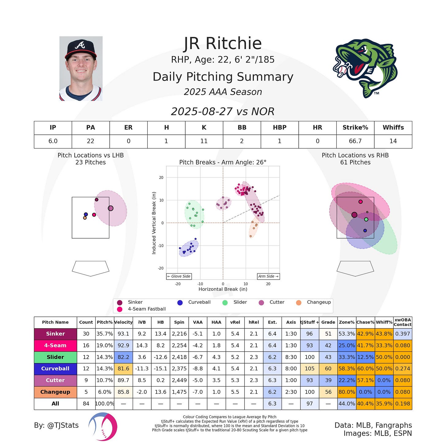 On the season, Ritchie’s compiled an 8-5 record and 2.75 ERA across three levels. He’s at a career-high 117.2 innings, more than double 2024’s 49.2 that he got in after returning from Tommy John surgery. Between the workload and Atlanta’s lack of flexibility with the 40-man roster, I don’t expect the Braves to call him up for a Major League start down the stretch…but stranger things have happened.