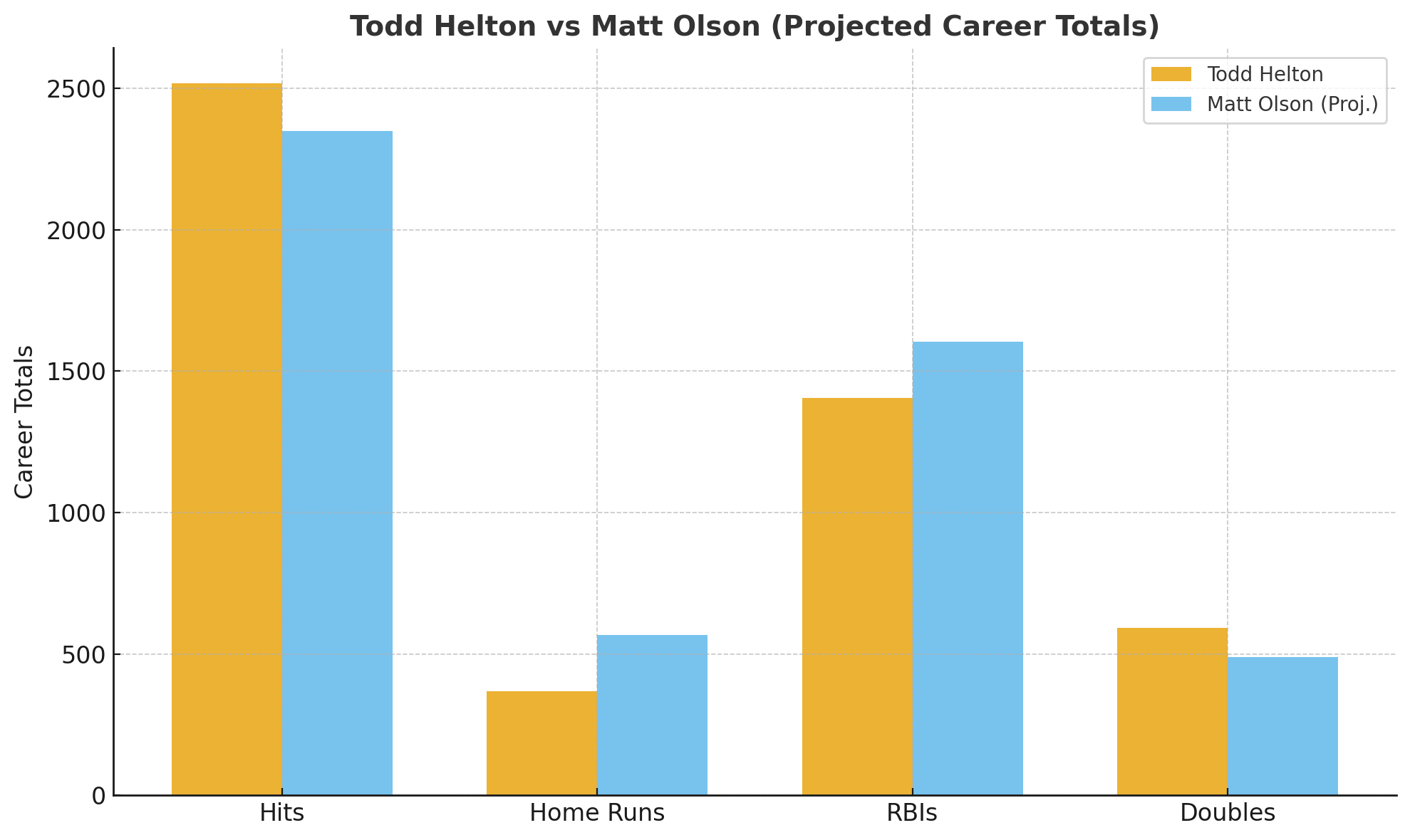 While Helton easily clears Olson’s career projection for hits, Olson is estimated to clear Helton in both home runs and RBI at the current pace he’s producing.