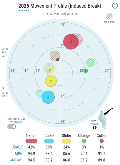 While he can’t overuse it - Holmes allowed a .467 average and .867 slug on 8.2% usage last year - this year’s version also has more drop and more horizontal movement than last year’s, allowing it to better disguise with both the fastball and the two breaking pitches out of the hand.