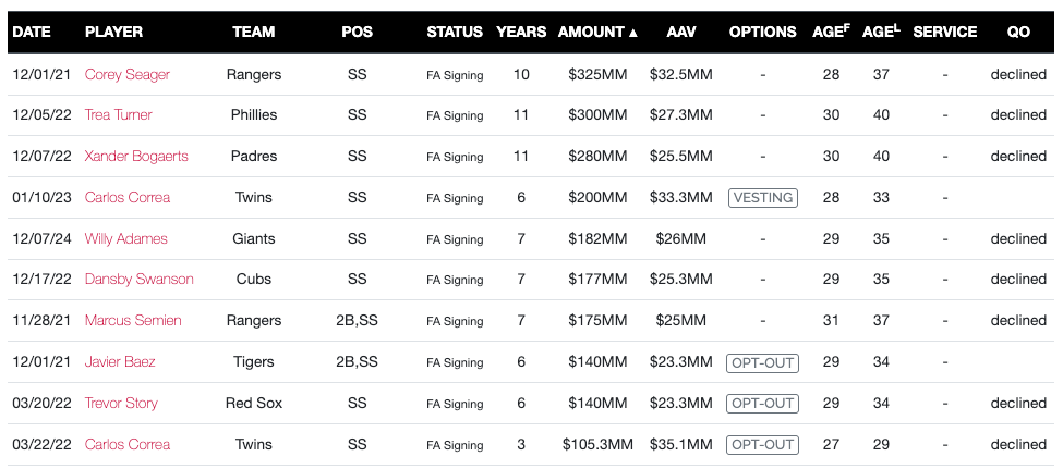 Every deal in the group received and declined a qualifying offer, except for Javier Báez and Carlos Correa’s follow-up contract, both of which were ineligible. Those declined qualifying offers trigger additional compensation from the signing team - the forfeiture of a draft pick somewhere between the 2nd and 4th rounds, depending on luxury tax status and revenue sharing eligibility, as well as loss of some of the team’s international free agency bonus pool in the next signing period.