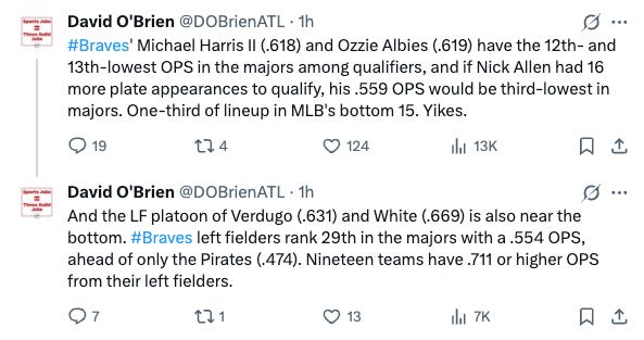 That’s right, one-third of Atlanta’s everyday lineup are among the fifteen worst players in baseball as sorted by OPS. As of gametime on Tuesday, there were 161 players qualified for the leaderboards (3.1 PAs per team game), so being in the bottom fifteen represents the worst 10% of hitters in baseball.