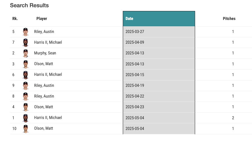 As of the end of their series with the Los Angeles Dodgers, the Braves led MLB with 11 batted balls at 110+ mph that went for outs. They’re the only team in double digits—the next closest are the Pirates and Mariners, with eight apiece.