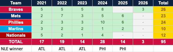 But usually, the more SSDs you have, the better you do in the full-season standings. The Braves and Mets tied at 101 wins in 2022, with Atlanta taking the East via tiebreaker, and they had the most and second-most SSDs that season. In 2023, the Braves won the division and led in SSDs, while Philly had the most in 2024 and won the East that year. 2025 was a tie between Philly and the Mets, with Philadelphia winning the division and New York narrowly missing out on the postseason via tiebreaker.
