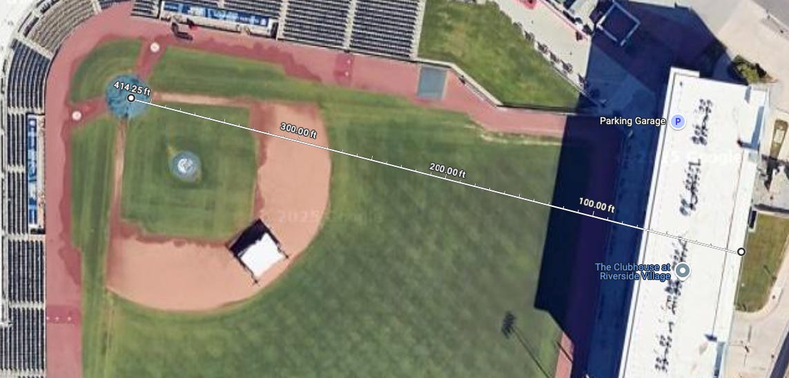 Despite the wonderful camera work, we don’t know exactly how far it went but using the location of the videoboard and Google Maps, we can estimate: 415 feet.