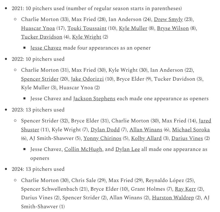 To get those ten (or more), Atlanta will once again dip into the depth they’ve built over the offseason. The other options not accounted for in the projections are Davis Daniel, Royber Salinas, and any prospects other than Hackenberg that get called up this year (like Lucas Braun or Ian Meija, among others.)