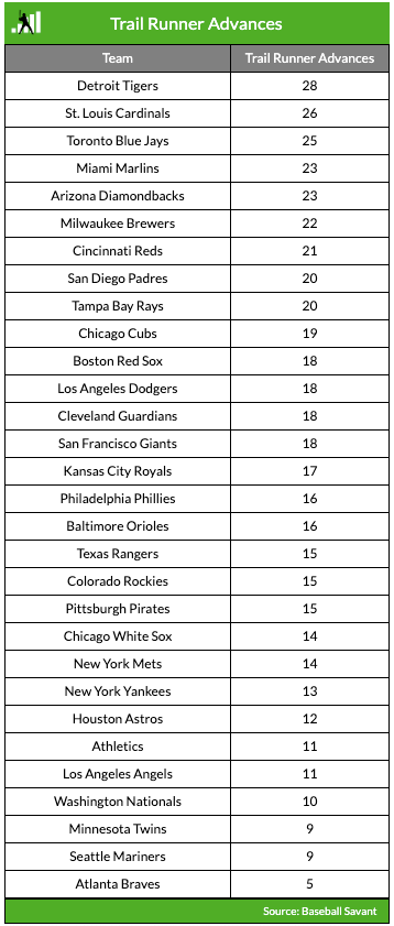 First, the raw numbers on how many times each team was able to advance that trailing runner: