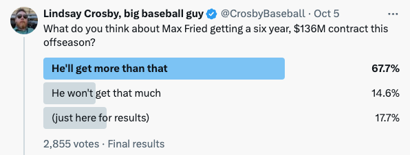 But I don’t expect it’ll come in that low. While we don’t know for sure which other pitchers will decline options and enter the market, Fried’s considered either the 2nd-best starter available behind Corbin Burnes or potentially the 3rd-best if Blake Snell opts out. Everyone else that could opt-out - your Jordan Montgomery, your Robbie Ray, your Michael Wacha - would be a tier below Fried.
