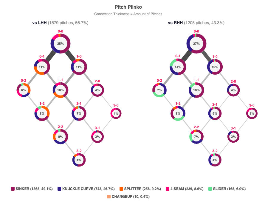 How to read a plinko chart: Each circle represents the usage of a pitcher’s arsenal in a given count (color key below). The thickness of the connecting lines reflects how often each count occurs, helping show how a pitcher navigates an at-bat.