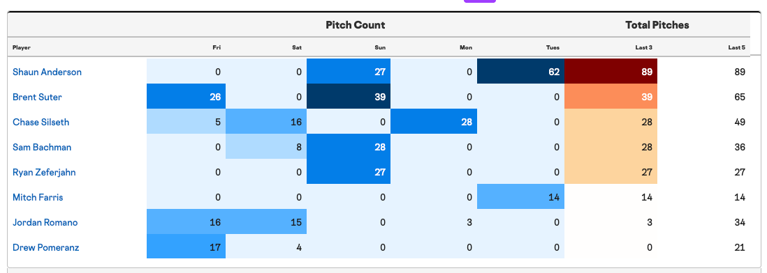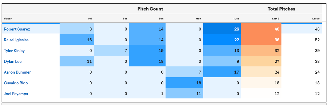 Robert Suarez and Raisel Iglesias are guys that you’d like to give the day off from a pitch count perspective, but that likely won’t happen today of it’s a close game. Aaron Bummer probably won’t be asked to pitch three consecutive days unless it’s an emergency (or they don’t want to trust José Suarez as the second lefty out in any sort of leverage situation)