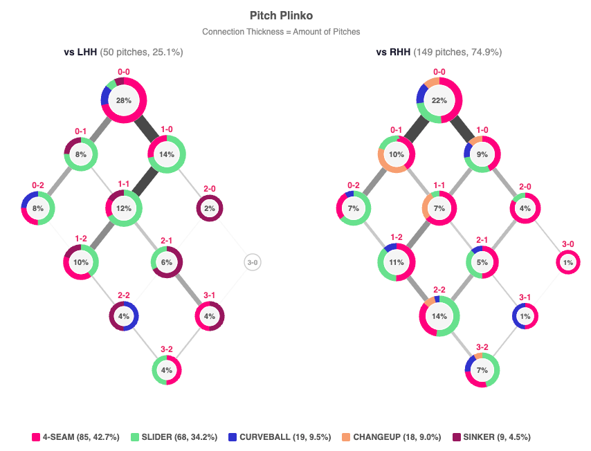 vs RHH: 45% slider, 35% four-seam, 13% cutter, 7% curveball, <1% kick-change