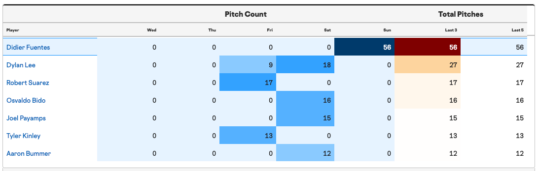 You wonder how much the team wants to push Dylan Lee, who developed some homer issues last season after the largest workload of his career (74 appearances, 68.1 innings). He might not be the first lefty out of the pen tonight, with Aaron Bummer being called on instead, in hopes of letting him avoid three games in four days.
