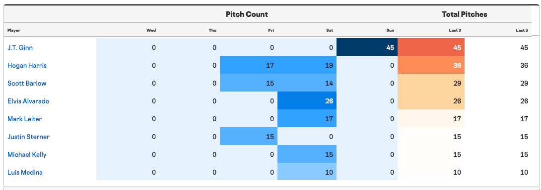 J.T. Ginn, the designated long man for the Athletics, pulled a Didier Fuentes and finished Sunday’s loss, saving the rest of the pen. He’ll be down today.
