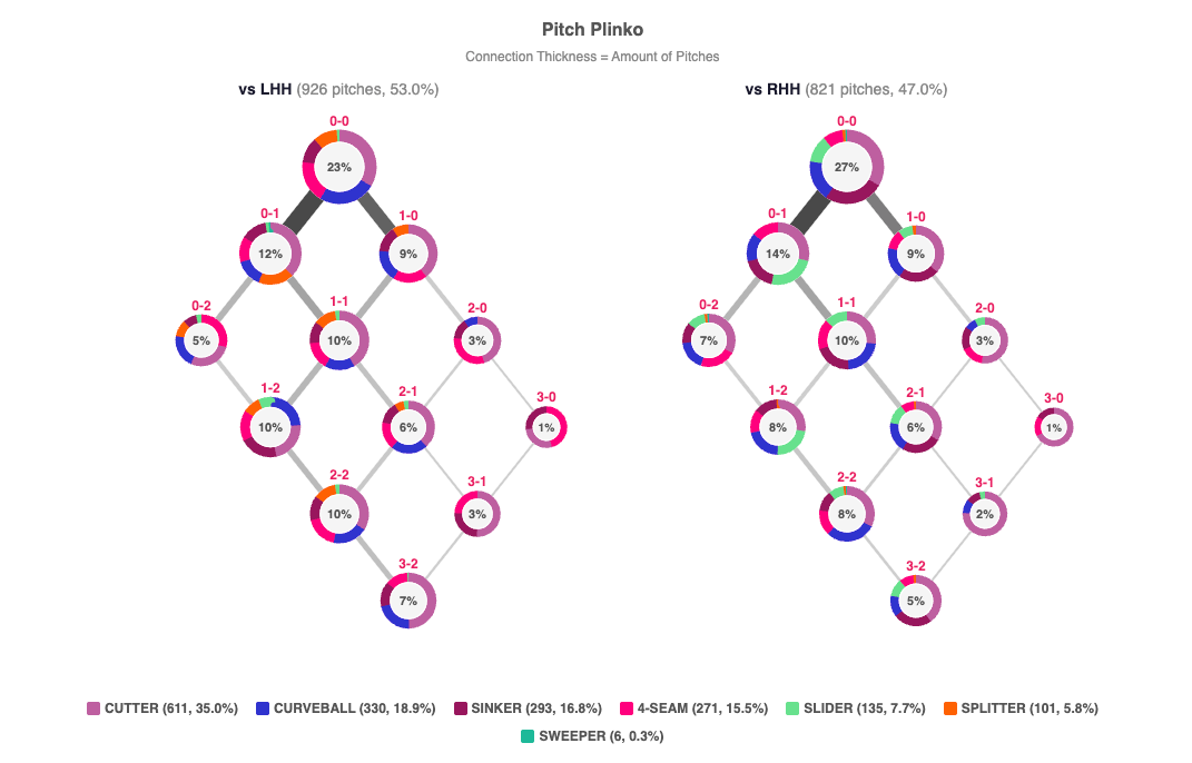 34% cutter, 20% sinker, 18% curveball, 14% slider, 12% four-seamer, 1% splitter