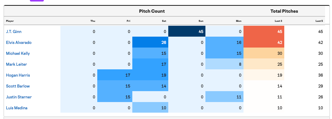 JT Ginn likely still isn’t back from Sunday’s bulk work, and Elvis Alvarado’s 42 pitches in the last three days mean he’s also down for everything but emergency situations.