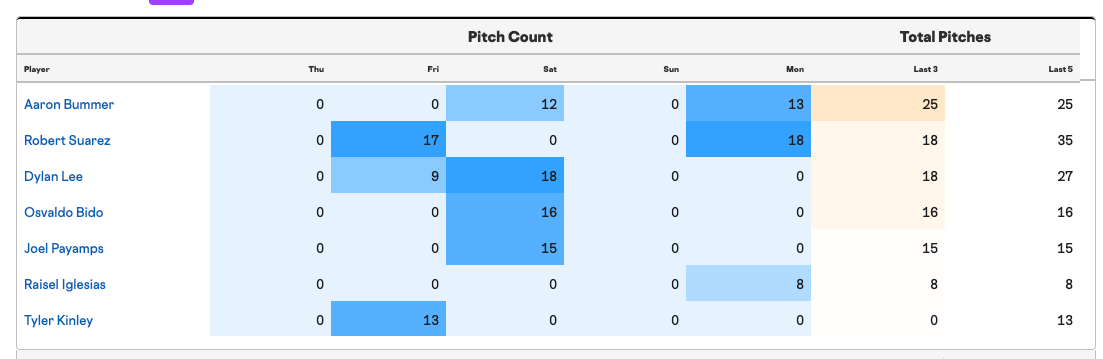 Raisel Iglesias’s eight pitches won’t prevent him from coming back tonight in a save situation, but Robert Suarez might be a guy they want to stay away from after last night’s 18-pitch outing.