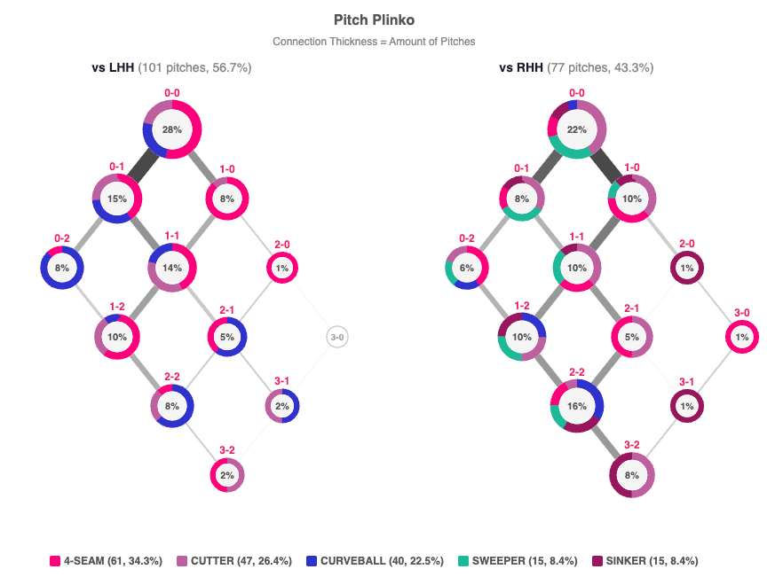 How to read a plinko chart: Each circle represents the usage of a pitcher’s arsenal in a given count (color key below). The thickness of the connecting lines reflects how often each count occurs, helping show how a pitcher navigates an at-bat.