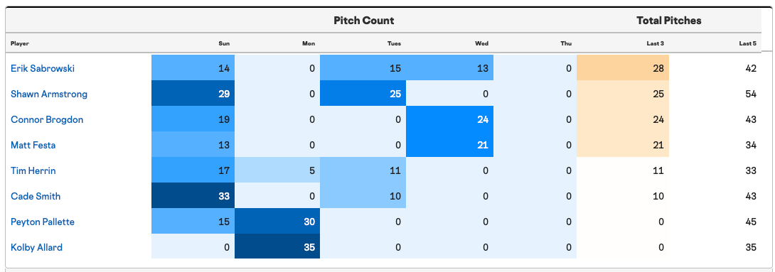 Neither of the two twenty-plus pitch arms from Wednesday, Connor Brogdon or Matt Festa, should be unavailable tonight thanks to the off day and that being their fist action since last Sunday.