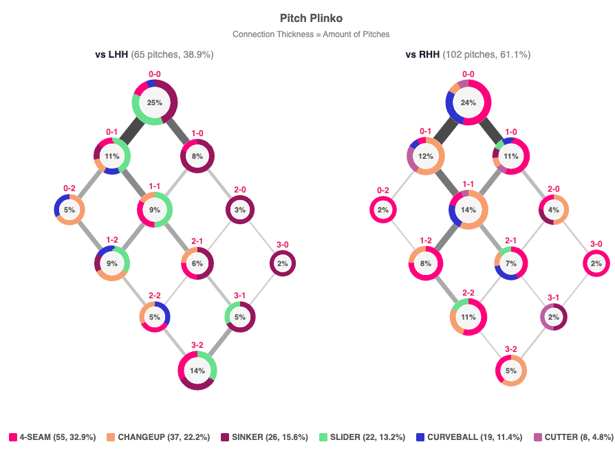 How to read a plinko chart: Each circle represents the usage of a pitcher’s arsenal in a given count (color key below). The thickness of the connecting lines reflects how often each count occurs, helping show how a pitcher navigates an at-bat.