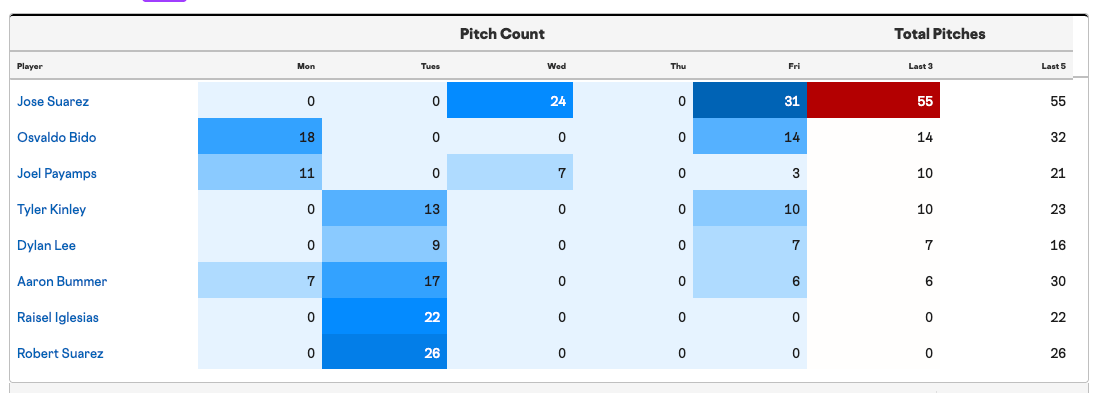 Joel Payamps, Dylan Lee and Aaron Bummer pitched last night, given that none of them needed even ten pitches, they should all be available if needed tonight. Osvldo Bido threw 14, so you’d like to stay away from him, but he can come back if needed.