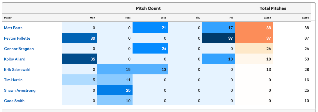 Matt Festa (3-day pitch count) and Peyton Pallette (last night’s pitch count) should both be down today, in an ideal scenario.