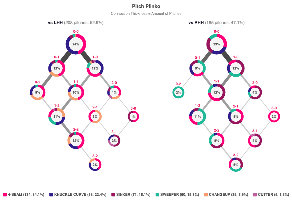 How to read a plinko chart: Each circle represents the usage of a pitcher’s arsenal in a given count (color key is on the bottom of the graphic). The thickness of the connecting lines reflects how often each count occurs, helping show how a pitcher navigates an at-bat.