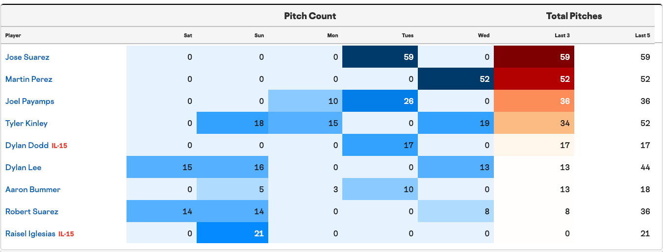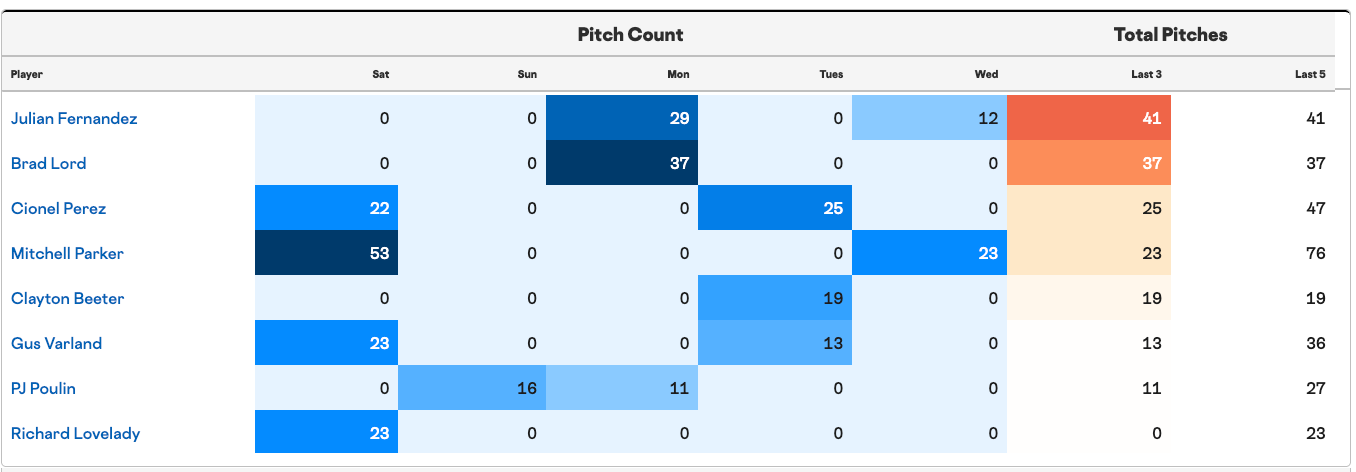 Long man Mitchell Parker threw 23 pitches last night, but could likely give them another inning today if needed. Julian Fernandez, at just 12 pitches, should be down based on three-day pitch count but would likely take the ball if needed.
