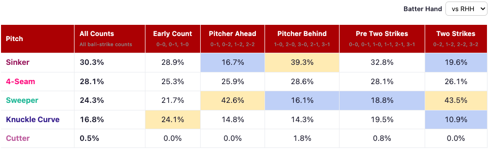 vs RHH: Sinker, four-seamer, sweeper, curveballs as an early strike stealer