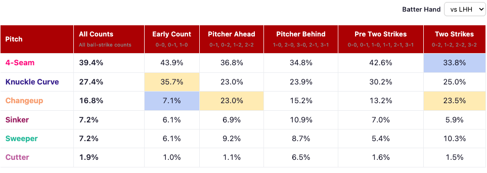 vs LHH: 34.8% four-seam, 27.5% changeup, 19.6% curveball, 17.6% cutter, 0.5% sweeper