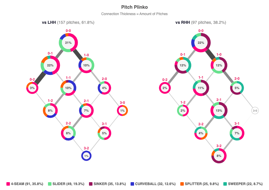 How to read a plinko chart: Each circle represents the usage of a pitcher’s arsenal in a given count (color key below). The thickness of the connecting lines reflects how often each count occurs, helping show how a pitcher navigates an at-bat.