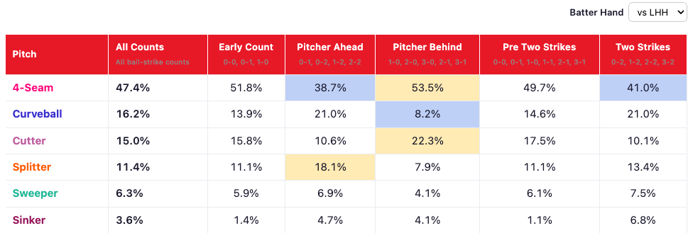 vs LHH: Four-seam dominant, curveball/splitter when ahead