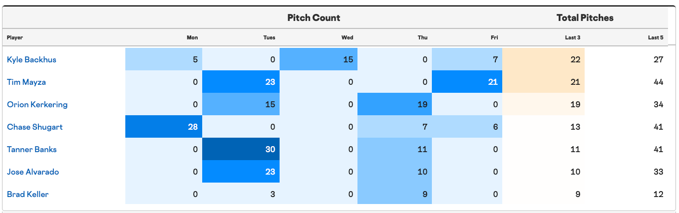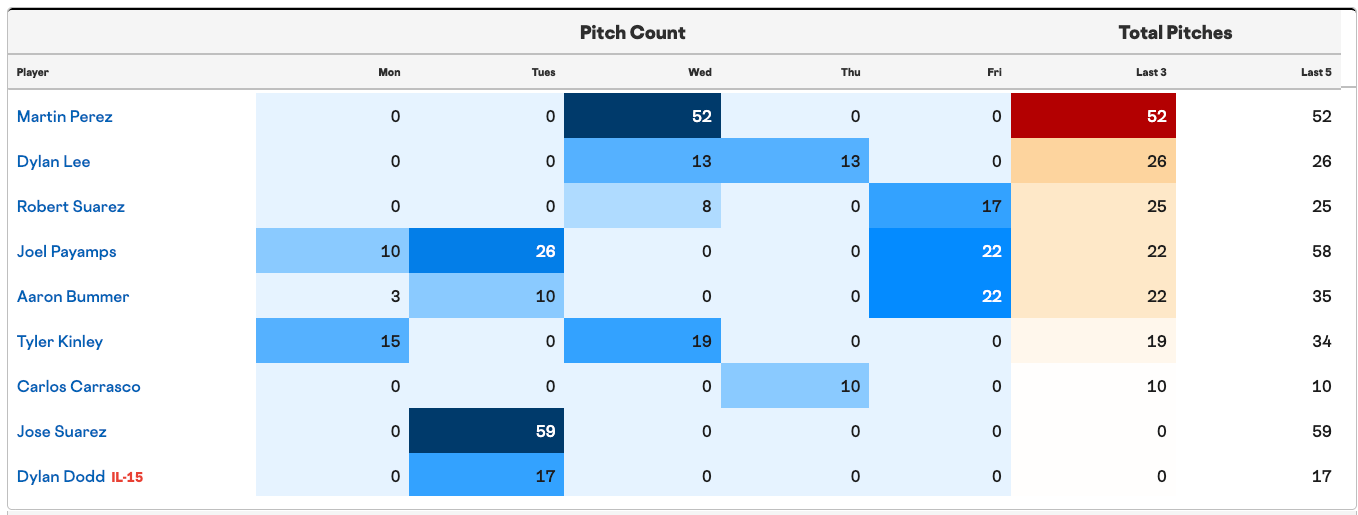 Martín Pérez should still be down today, based on Wednesday’s workload, but José Suarez has had three days of rest and can probably cover an extended outing if this one’s a blowout.