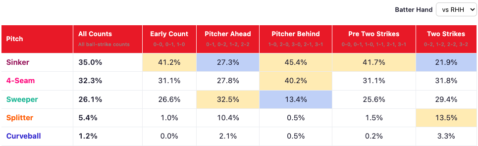 vs RHH: 48% sinker, 40% slider, 8% four-seamer, 3% changeup