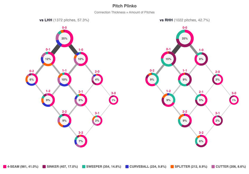How to read a plinko chart: Each circle represents the usage of a pitcher’s arsenal in a given count (color key is on the bottom of the graphic). The thickness of the connecting lines reflects how often each count occurs, helping show how a pitcher navigates an at-bat.