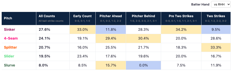 vs RHH: Fastball-heavy mix, slurve early in the count (and never when behind), splitter and four-seamer with two strikes