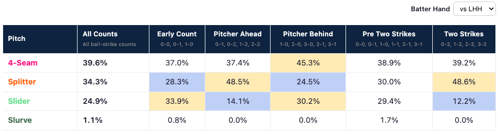 vs LHH: Mostly a well-balanced three-pitch mix, 4S/SL when behind and splitter as the putaway pitch