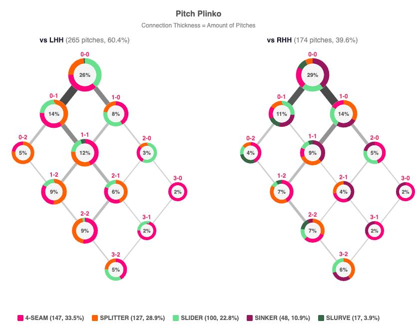 How to read a plinko chart: Each circle represents the usage of a pitcher’s arsenal in a given count (color key is on the bottom of the graphic). The thickness of the connecting lines reflects how often each count occurs, helping show how a pitcher navigates an at-bat.