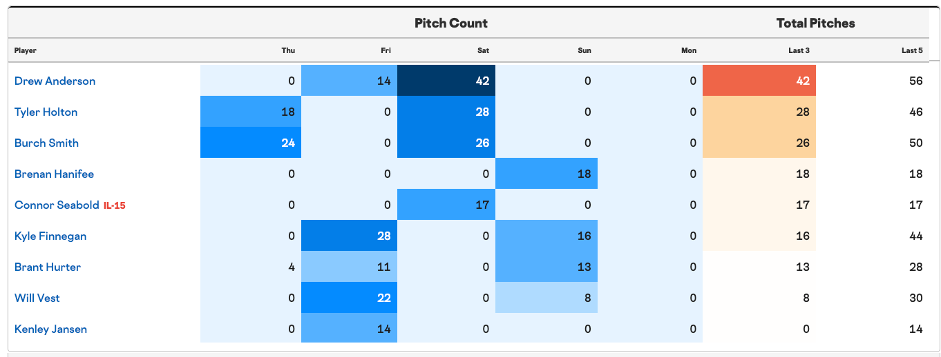 Long man Drew Anderson might be available tonight - 42 pitches is exactly the pitch count where some teams want to give three days of rest but others are fine going with two.