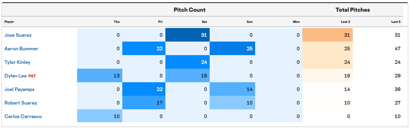 Aaron Bummer threw 25 pitches on Sunday but should be good to go, which is nice, given that Dylan Lee’s on paternity leave.