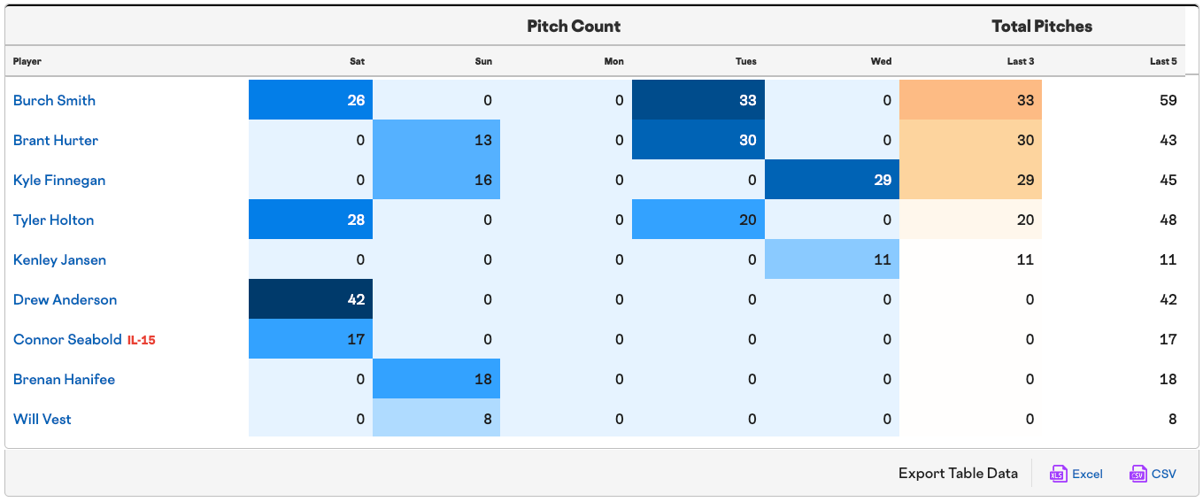 Burch Smith and Brant Hurter have both gotten one day of rest after throwing 30+ pitches on Tuesday, so they’re in that nebulous zone of ‘does he get one more day or is he back?’ that changes from manager to manager.