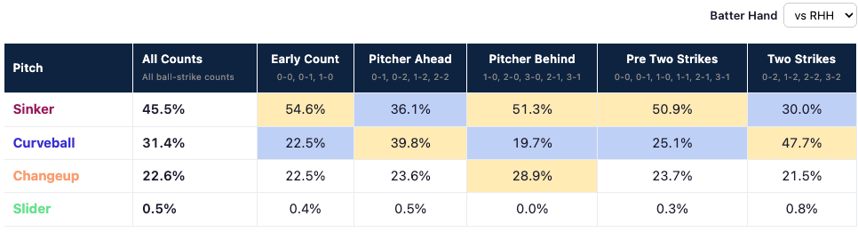 vs RHH: Sinkers early, sinkers & changeups when behind, curveball as the primary putaway pitch with two strikes