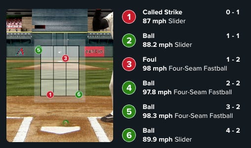 The first two Arizona hitters, SS Geraldo Perdomo and DH Pavin Smith, both walked in pretty non-competitive at-bats. After 1B Josh Naylor grounded out, pushing the runners to 2nd and 3rd, catcher Gabriel Moreno was up.