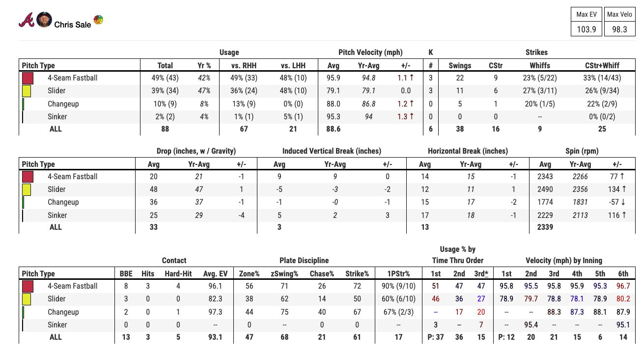 Sale remarked in his postgame media availability that he was aware of how good the defense played behind him, citing both the double plays and some diving catches from Eli White, Ronald Acuña Jr., and Austin Riley.