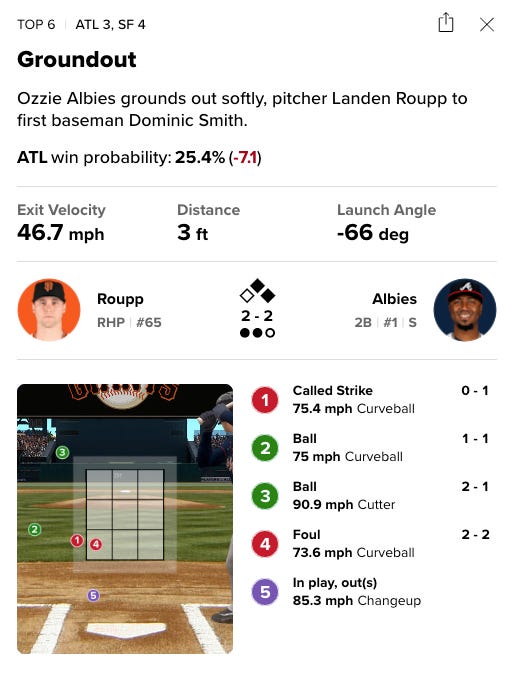After the Braves got a two-out single from Michael Harris and a Sean Murphy walk, Ozzie came up with the game-tying runner in scoring position. Facing starter Landen Roupp, Ozzie worked a five-pitch at-bat that finished with him weakly bouncing a grounder back up the middle for the final out of the inning.