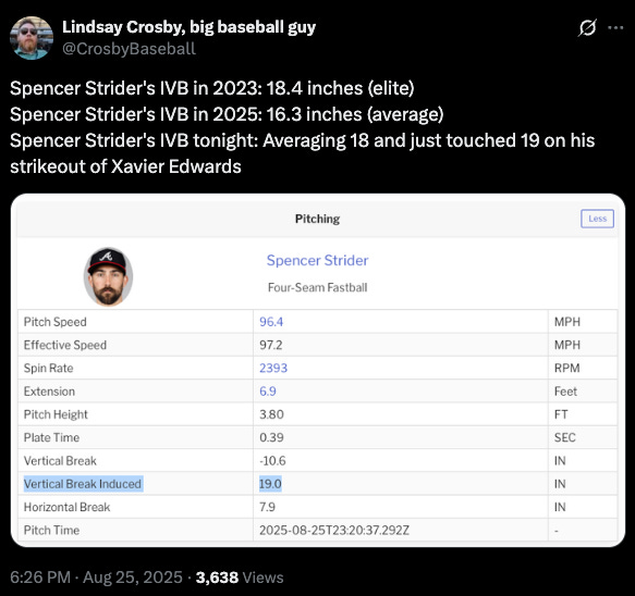This performance, though, was not very Strider-like, but more Greg Maddux-like. The aforementioned three ground balls were part of a career-high nine for Strider, whose previous record in a single game was eight. Not to mention, the induced vertical break on Strider’s four-seam was up to near where it was in 2023, an encouraging improvement over the merely league-average numbers he was putting up earlier this season.