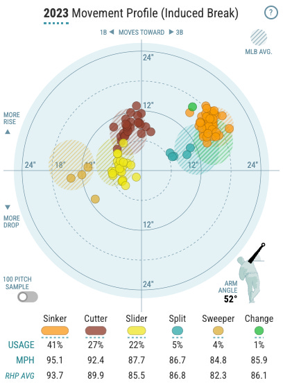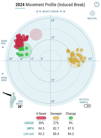 In 2023, 83% of his sweepers were thrown to righties and all of his changeups were thrown to lefties