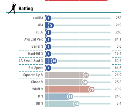 It’s admittedly an ugly top-half of the Statcast card for Allen - a LOT of blue, with Allen among the worst in the league in several categories. Even though he doesn’t whiff excessively, it’s not helping him avoid striking out more than league average.