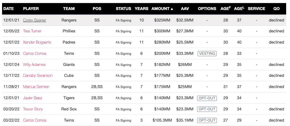 And shortstops always get paid. Here’s a partial list of recent shortstop free agent deals, almost universally for longer and a higher AAV than would be recommended in a vacuum.